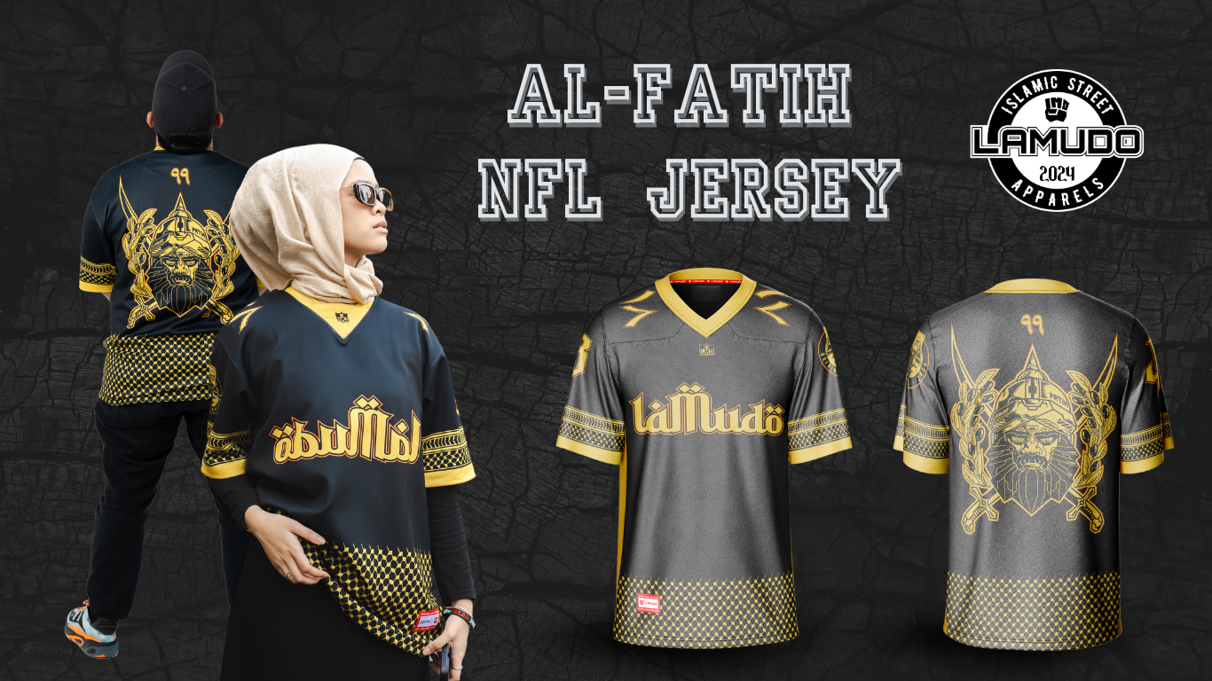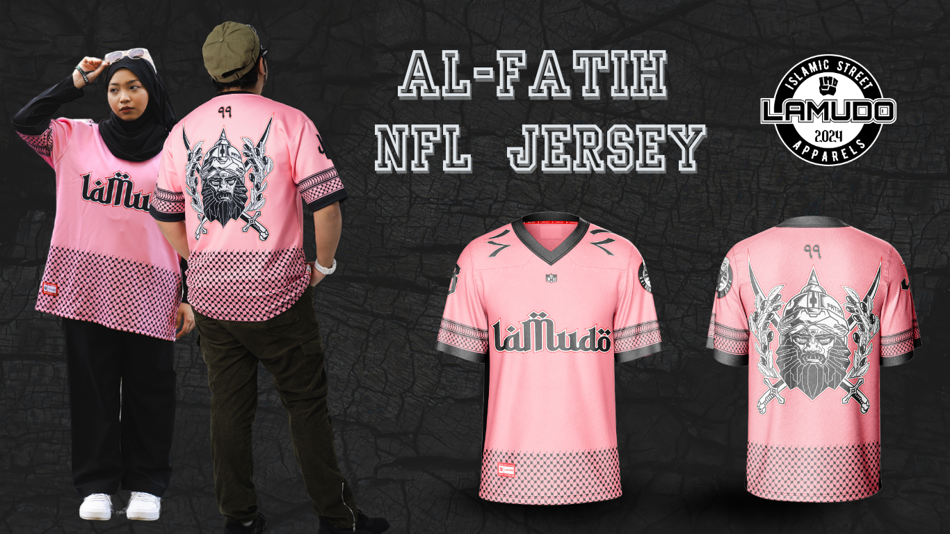 Channel Islamic history in style! The unisex Al-Fatih NFL Jersey (XS-XXXXL) offers comfort & performance with a bold pink, green and gold design inspired by Islamic motifs. Shop now!